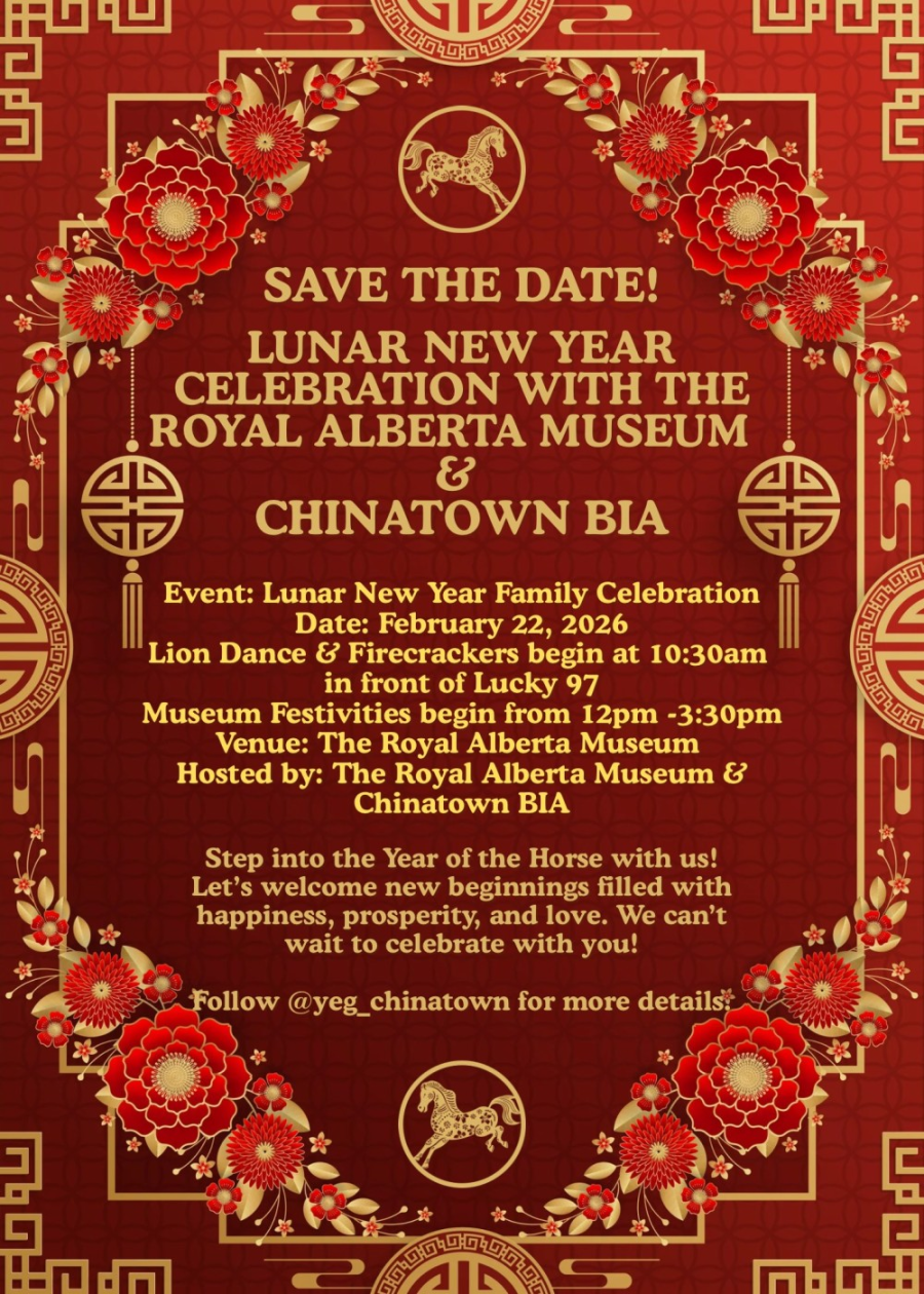 The Edmonton Chinatown Business Improvement Area (BIA), in partnership with the Royal Alberta Museum, invites the community to celebrate Lunar New Year and welcome the Year of the Horse on Sunday, February 22nd, 2026.